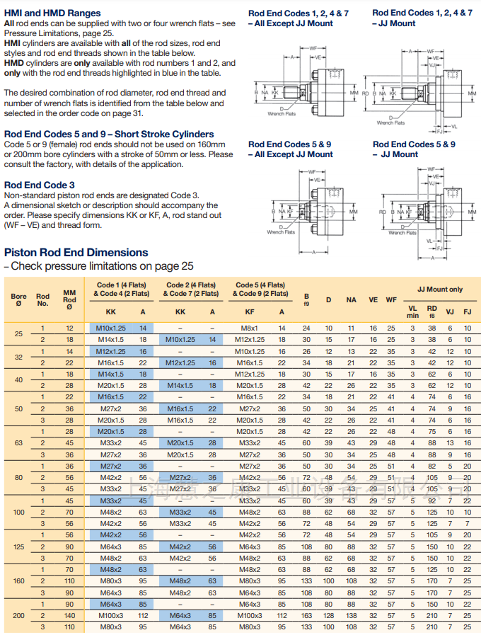 杆可以通过其末端印有的字母“K"来识别。 不同的大压力额定值适用于更强的和双杆气缸的较弱杆——见压力限制,第25页。